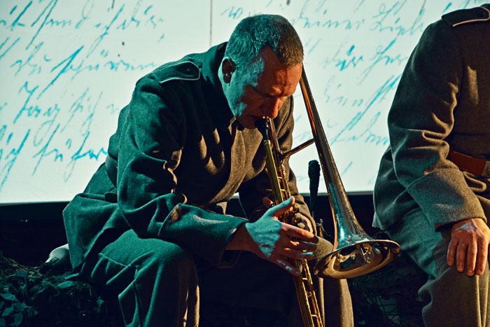 Szenen des expressionistischen Romans „Heeresbericht“ von Edlef Köppen kontrastieren mit der Lyrik August Stramms, Briefen von Soldaten, Alltagssituationen und Fragmenten offizieller Militärkommuniqués. Das Bühnenbild besteht aus Projektionen wechselnder Motive, die sich aus zeitgenössischen Fotos, Feldpostkarten und Bildern von kriegsteilnehmenden Malern zusammensetzen.
